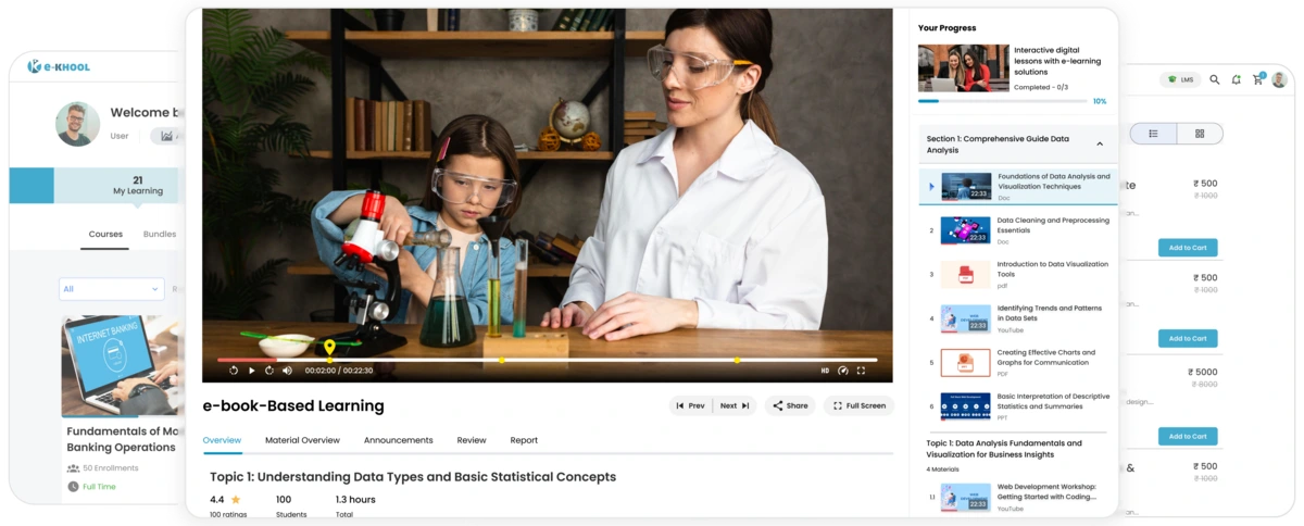Designed to support structured and blended learning, e-KHOOL LMS for schools enables educators to deliver lessons, manage classrooms, and monitor student progress effectively.