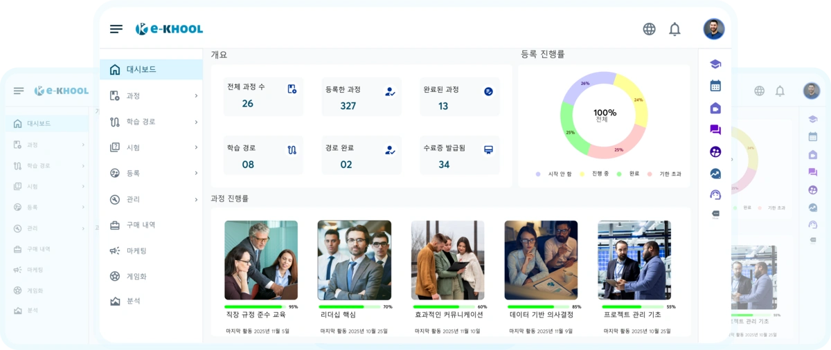 자체 e러닝 생태계를 구축하세요 – e-KHOOL!로 학습 플랫폼을 손쉽게 제작, 운영, 관리하세요.